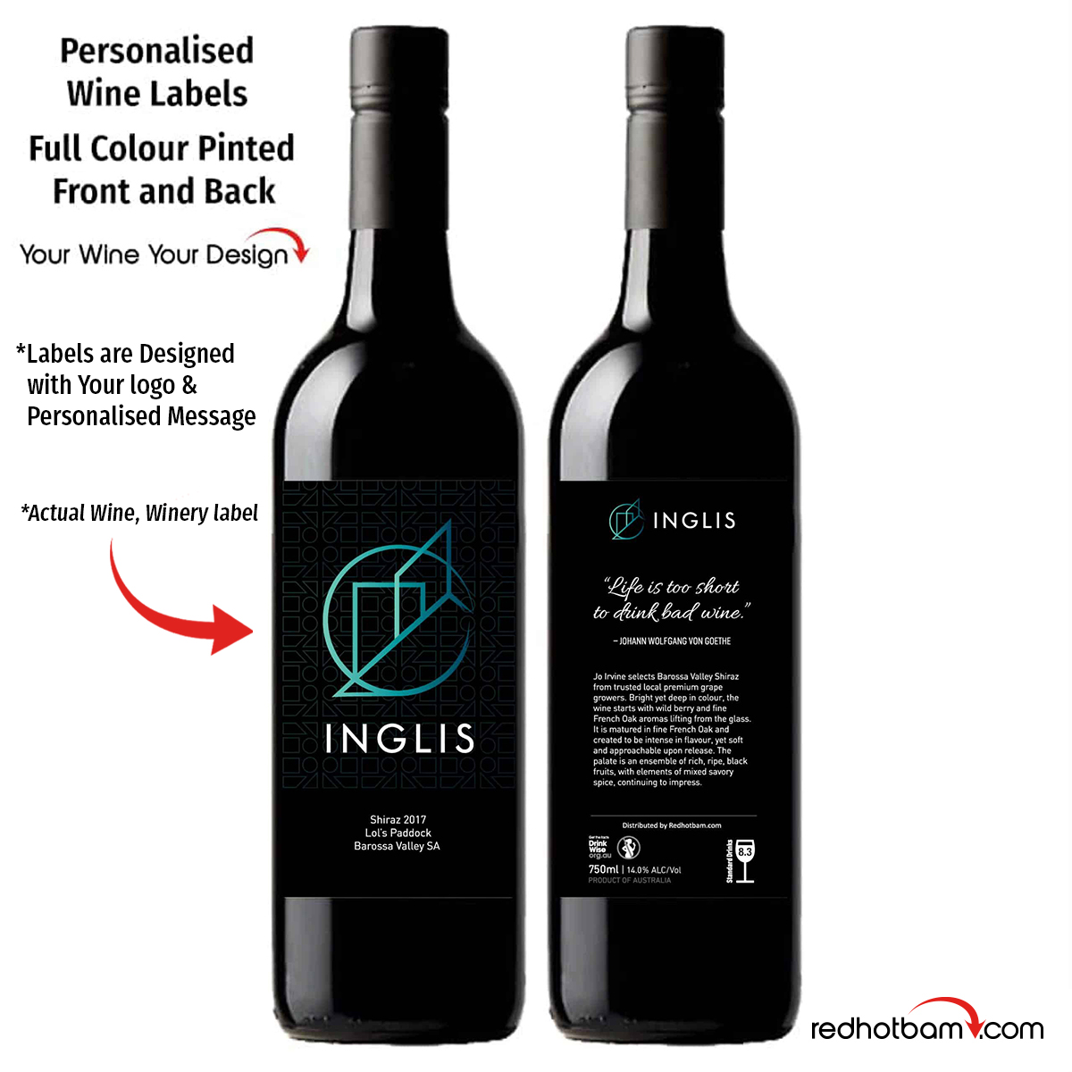 Branding Process: • Custom Printed Cylinder 500 x 340mm – CMYK Full Colour | • Personalised Wine Labels – CMYK Full Colour