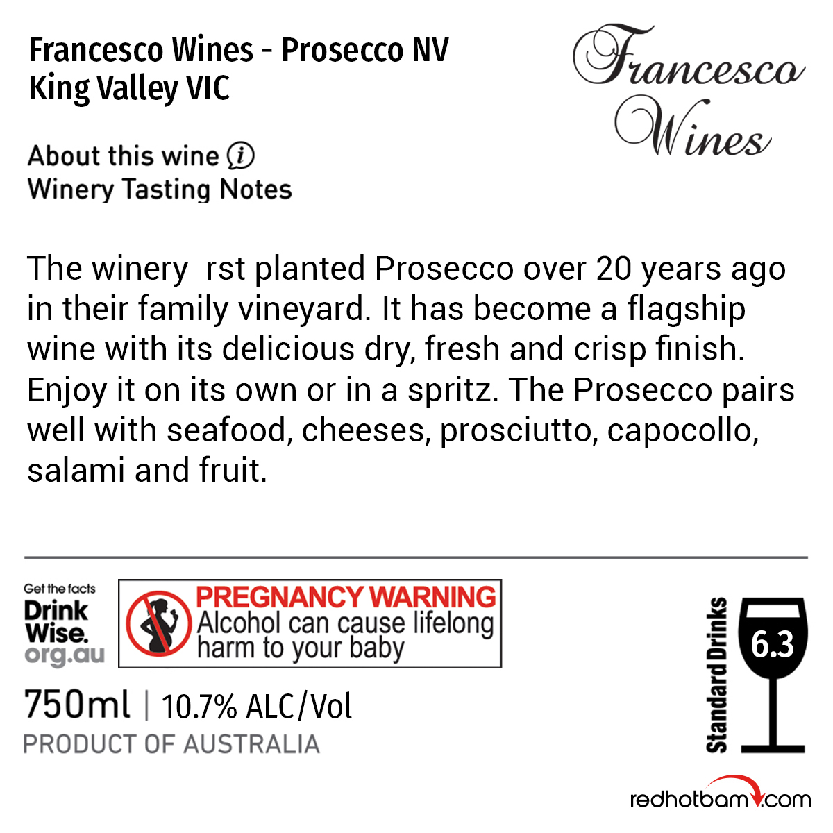 Francesco Wines – Prosecco NV – King Valley VIC $28.88 $25.38